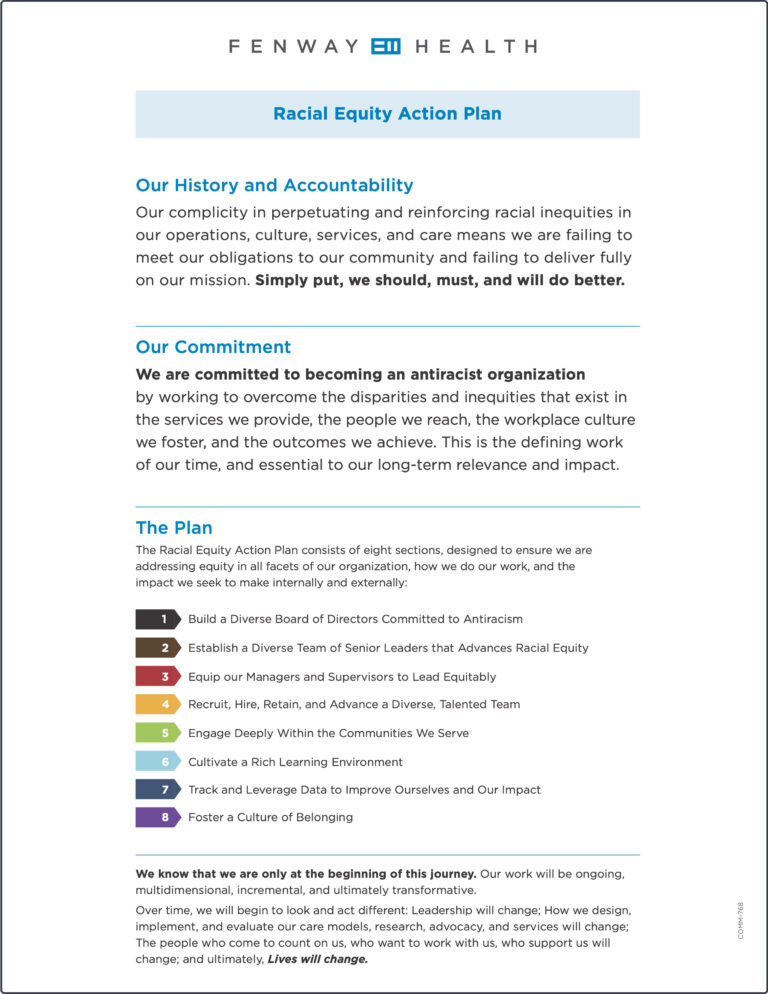 Fenway Health’s Racial Equity Action plan lays out ambitious but achievable goals for the first 12 months; the next 18-30 months; and then 36-60 months. When we announced our commitment to becoming an anti-racist organization, we promised to be transparent and provide regular updates on our work and accomplishments along the way. One of the ways we will do that is on our , which we encourage everyone to visit. We’ll also be talking about this work on our blog and in messages to our staff, patients, and community from our CEO, Board Chair, and others as we continue this work.